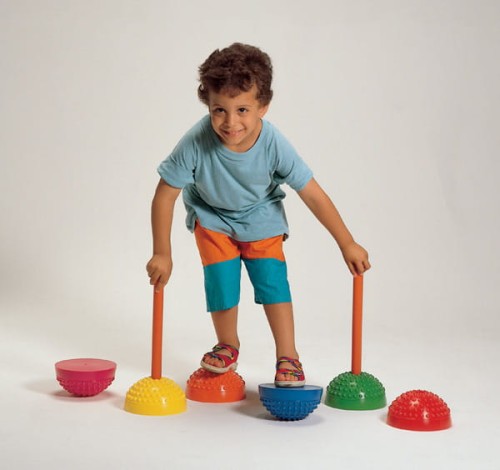 W zestawie sześć sztuk półkul z wypustkami. Te "najeżone" kamienie można napełniać wodą lub powietrzem w zależności od potrzeb. Półkule wykorzystuje się w tworzeniu torów przeszkód, do ćwiczenia równowagi lub zabaw ruchowych.Średnica kamieni 16 cm, wysokość 8 cm.
