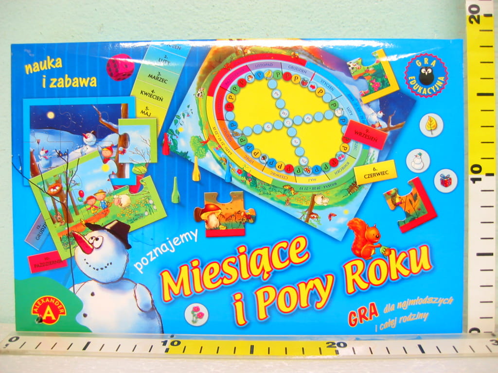 Podczas gry i zabawy dzieci uczą się nazw i kolejności miesięcy oraz ich związku z następującymi po sobie porami roku. To samo dotyczy dni tygodnia, których nauka odbywa się przy dobrej zabawie. Zawartość opakowania :plansza, 4 pionki, kostka do gry, 48 tabliczek z nazwami miesięcy, 7 tabliczek z nazwami dni tygodnia, 24 puzzle, 8 żetonów z obrazkami, instrukcja. Wymiary opakowania: 19 x 28,5 x 3,5 cm