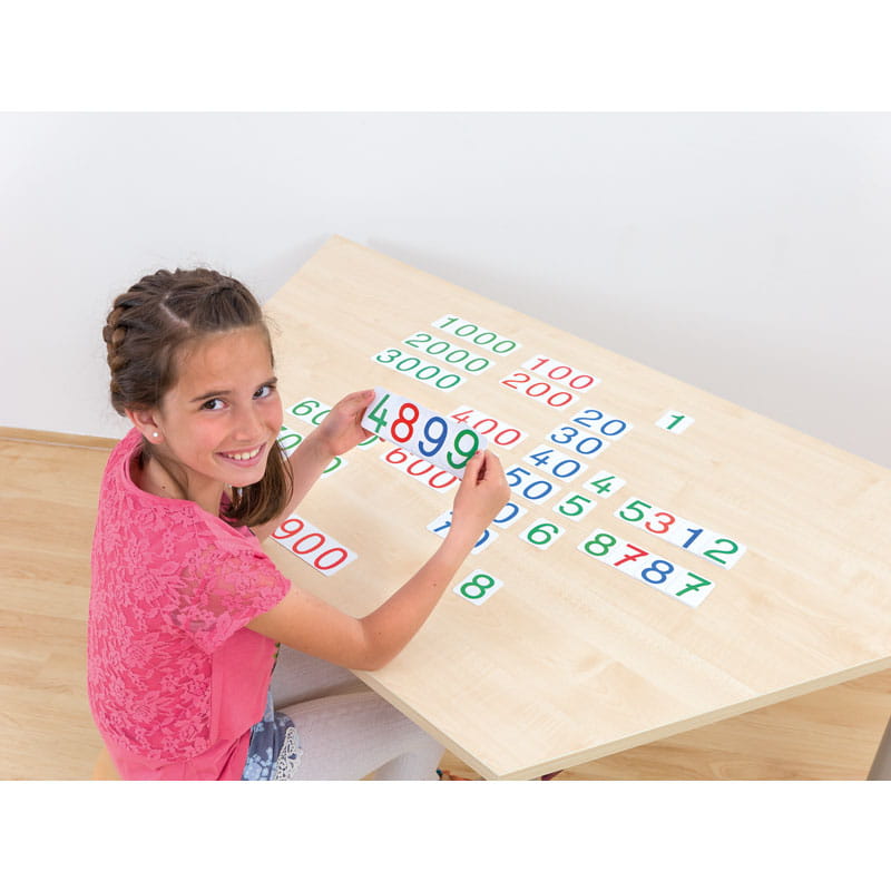 Karty liczbowe prezentują w kolorystycznym ujęciu liczby kolejnych rzędów. Nałożone na siebie tafelki wyraźnie pokazują, jak zbudowane są liczby wielocyfrowe i uzmysławiają wartość cyfry od jej pozycji w liczbie.