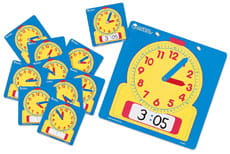 Ekonomiczny zestaw do ćwiczeń odczytu i zapisu czasu dla całej klasy. Duża tarcza demonstracyjna  oraz 24 tarcze uczniowskie . Tarcze wyposażone są w ruchome wskazówki, których kolory zgodne są z podziałką tarczy na godziny (kolor czerwony) i minuty (kolor granatowy), co znacznie ułatwia naukę odczytu czasu. Każda tarcza posiada miejsce na zapis czasu mazakiem suchościeralnym. Uczniowie mogą więc z łatwością śledzić demonstrację nauczyciela, manipulując jednocześnie własną tarczą. Wykonane są z trwałej, laminowanej tektury.