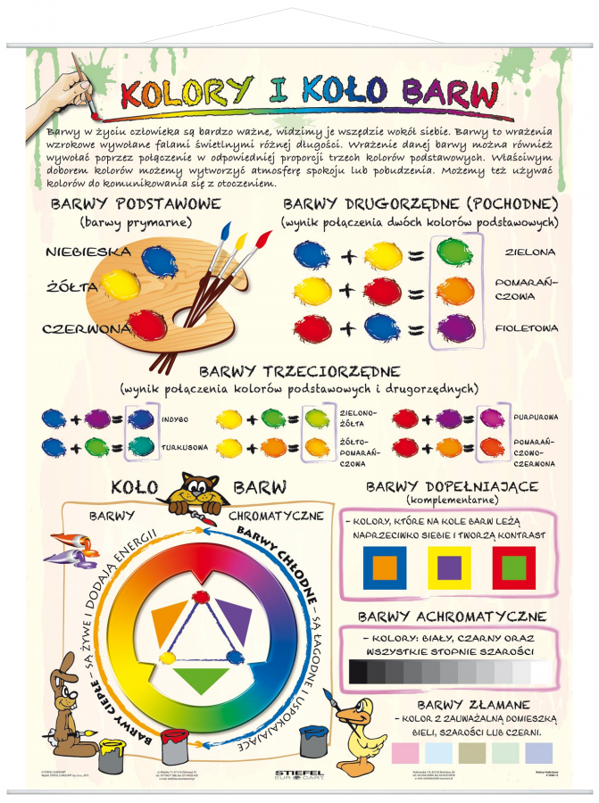 Plansza jednostronna ,format 100 x 140,laminowana, oprawiona w drewniane wałki. Treść planszy szkoleniowej jest wstępem do teorii kolorów. Opisuje podział barw na: podstawowe, drugorzędne, trzeciorzędne, barwy komplementarne i achromatyczną w kole kolorów. Podstawowe pojęcia są uzupełnione odpowiednimi ilustracjami, aby lekcje były bardziej jasne .