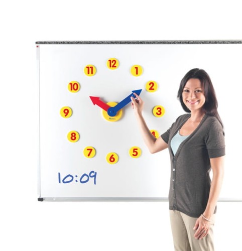 Zawartość: magnetyczne wskazówki z systemem kół zębatych (z tworzywa) - wskazówka minutowa o dł. 28 cm i szer. 6 cm - 12 krążków z liczbami 1-12 (z pianki) - instrukcja