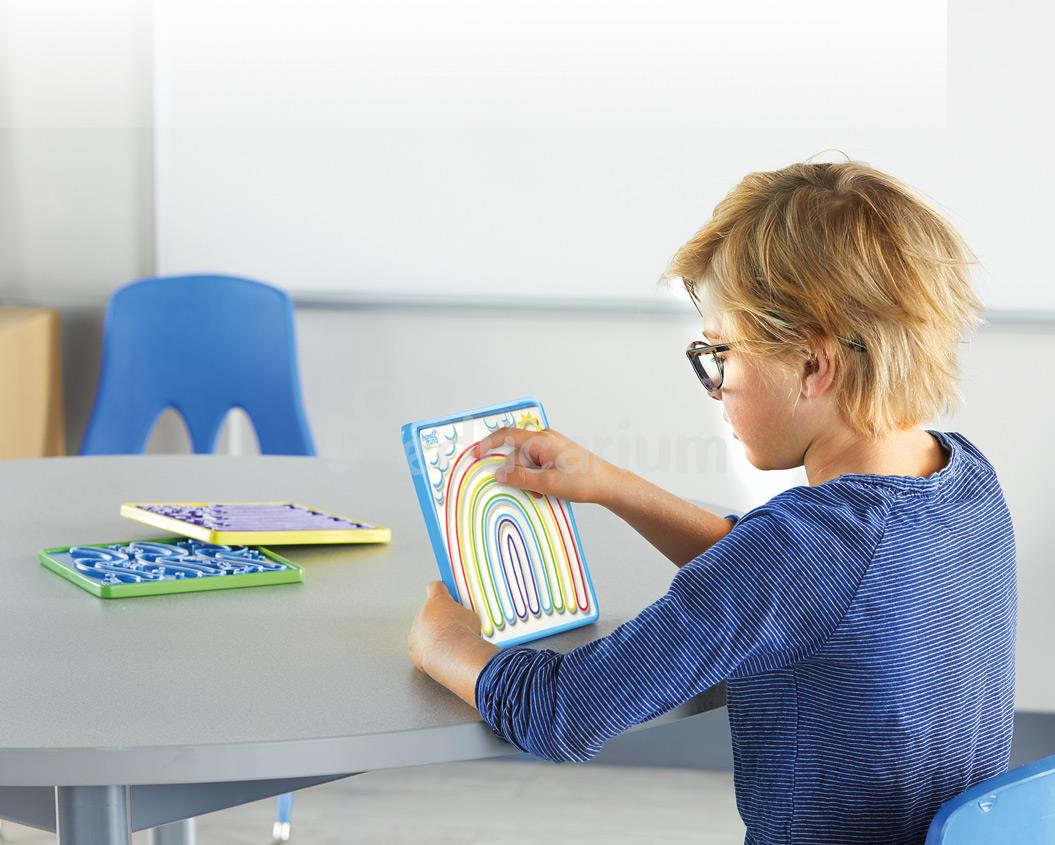 Ta pomoc edukacyjna to zestaw trzech dwustronnych plansz (18 x 18 cm) z rysunkami(-koniczynka, lew, labirynt, tęcza, gwiazdka i fale. Dziecko wodzi po nich palcem, ćwicząc w ten sposób poprawne trzymanie długopisu lub kredki