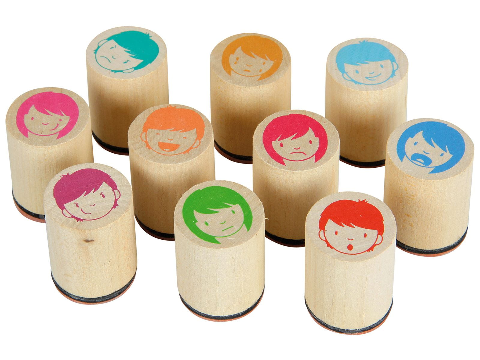 Zestaw 10 stempli pokazujących różne emocje, stemple są zrobione z drewna i gumy. Użycie pieczątek może pomóc nieśmiałym dzieciom wyrazić emocje. Wystarczy postawić na kartce papieru odpowiednią pieczątkę by uzewnętrznić swoje uczucia. Wymiary: śr. 2,5 x 3,5 cm