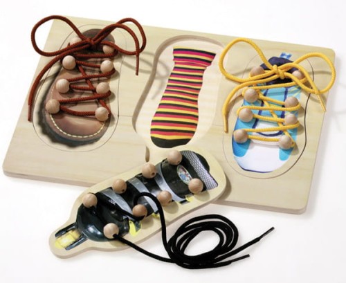 Drewniana podstawa uczy sznurowania butów i wiązania kokardki. Atrakcyjna forma zabawy i nauki samodzielności.