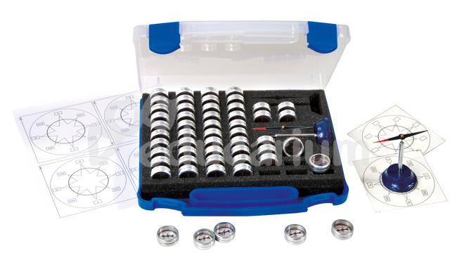 Dzięki temu zestawowi uczniowie nie tylko poznają zasady działania kompasu,ale mogą też samodzielnie eksperymentować Do tego służy para kompasów: jeden z nadrukiem kierunków świata, drugi - bez nadruku. Uczeń kładą kompasy na mapie, określają i oznaczają północ. Zauważają kierunek północny wskazany przez kompas bez nadruku i wyznaczają linie magnetyczne.