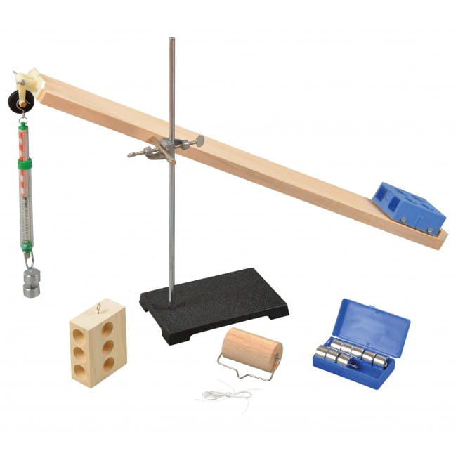 W skład zestawu wchodzi równia pochyła o długości 80 cm z przymocowanym kątomierzem i oraz zestaw akcesoriów: ciężarki, drewniany walec, klocek drewniany i plastikowy z otworami na ciężarki i siłomierz