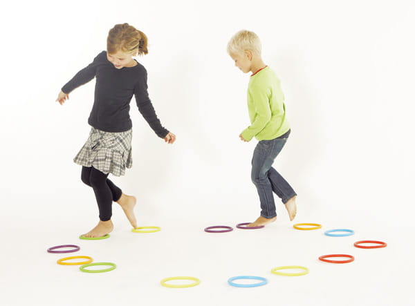 W zestawie dwadzieścia cztery elastyczne , kolorowe pierścienie o średnicy 16,5 cm. Inspirują one do wielu ćwiczeń i zabaw np.: taniec w kole ( trzymamy się za pierścienie), kolorowe kółka to wysepki, trzeba na palcach stanąć w środku, pierścienie to mini hula hoop (żonglujemy na nogach i rękach), idziemy szybko z kółkiem na głowie utrzymując równowagę , skaczemy obunóż z pierścieniem wokół kostek itp.