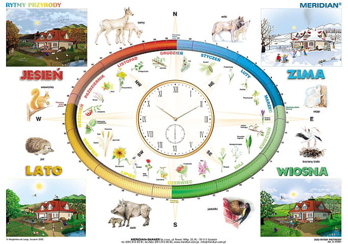 Plansza do nauczania aktywnego o sprawdzonej dydaktycznie konstrukcji . Odmierzanie czasu przy pomocy zegara z możliwością odniesienia do kalendarza, to praktyczna podstawa do ukazania cykliczności zmian zachodzących w przyrodzie. Naniesienie stron świata przygotowuje do późniejszej pracy z mapą - uczy orientacji. Rośliny, charakterystyczne dla danej pory roku, wizualizują wewnętrzną stronę kalendarza, rysunki zwierząt wzmacniają efekt wizualizacji po jego zewnętrznej stronie. W narożnikach - awers planszy - umieszczone zostały scenki z życia człowieka, specjalnie wymodelowane pod kątem pór roku. Wiosna, lato, jesień, zima podpatrzone w wiejskim domku z mnóstwem szczegółów, to przebogata a co najważniejsze gotowa scenografia do wielu tematów!