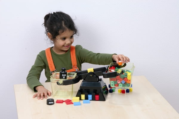 W zestawie znajdują się metalowe i plastikowe odważniki, które pozwalają na praktyczne ćwiczenia w liczeniu, porównywaniu masy i eksperymentach z wagą.