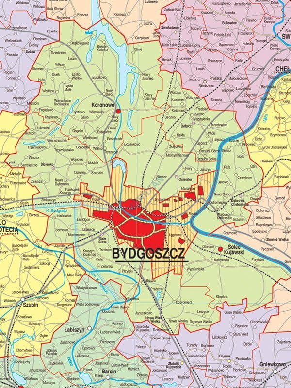 Mapa przedstawia podział administracyjny województwa kujawsko-pomorskiego wraz z uwzględnieniem sieci dróg, autostrad oraz kolei. Dodatkowo panel bocznych zawiera informacje o województwie oraz o poszczególnych powiatach, takie jak: powierzchnia, ludność, struktura administracyjna .Ilustrowana herbami.