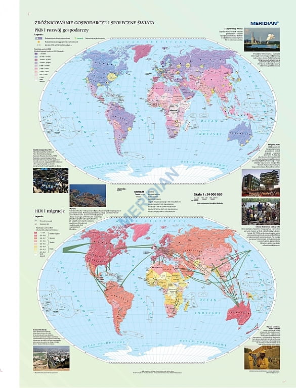 Ścienna, dwudzielna mapa szkolna syntetycznie przedstawiająca najbardziej aktualne, kluczowe zagadnienia z zakresu zróżnicowania gospodarczego i społecznego świata (stan na 2011).